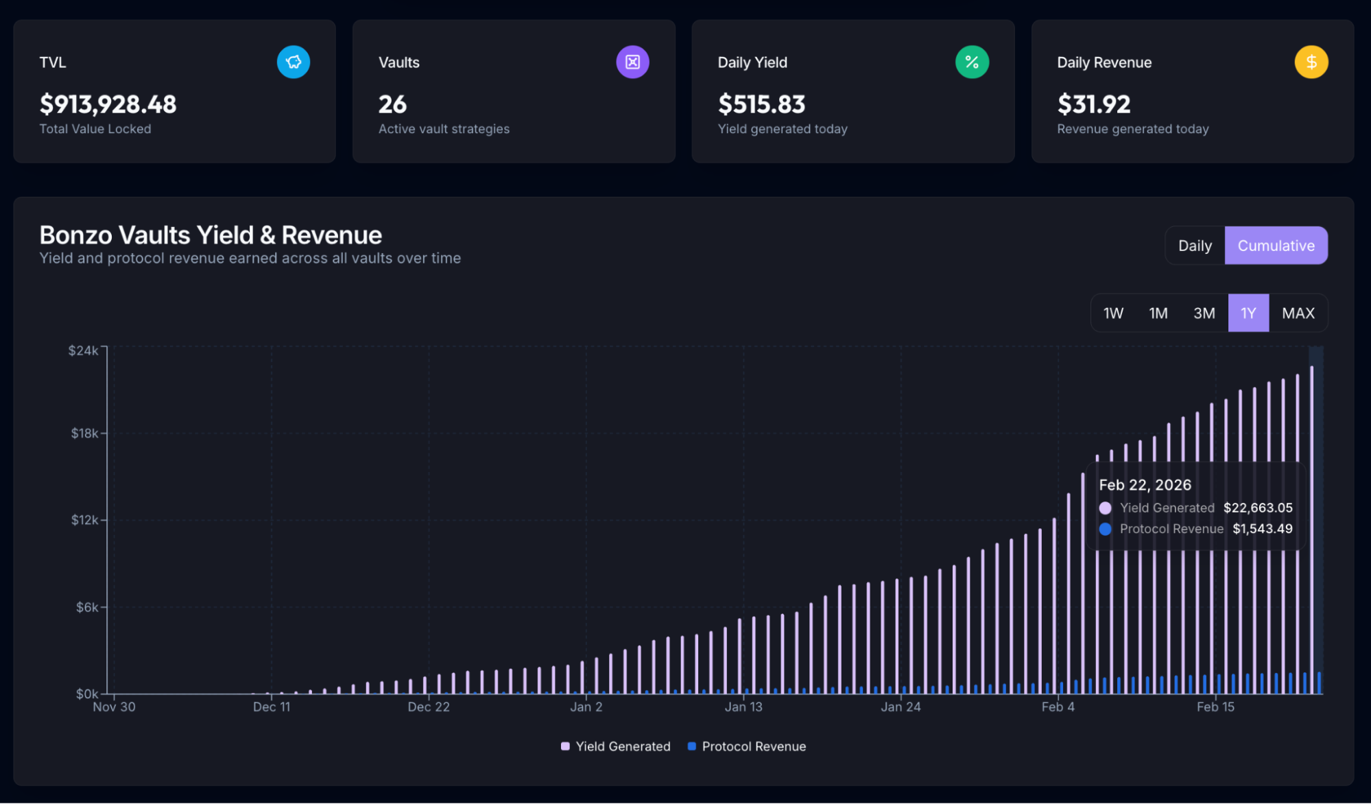 Bonzo Vaults launched in beta late December 2025 with two vault strategies: Single Asset DEX and Dual Asset DEX and currently has $914k in TVL and over $22k in yield generated for users.