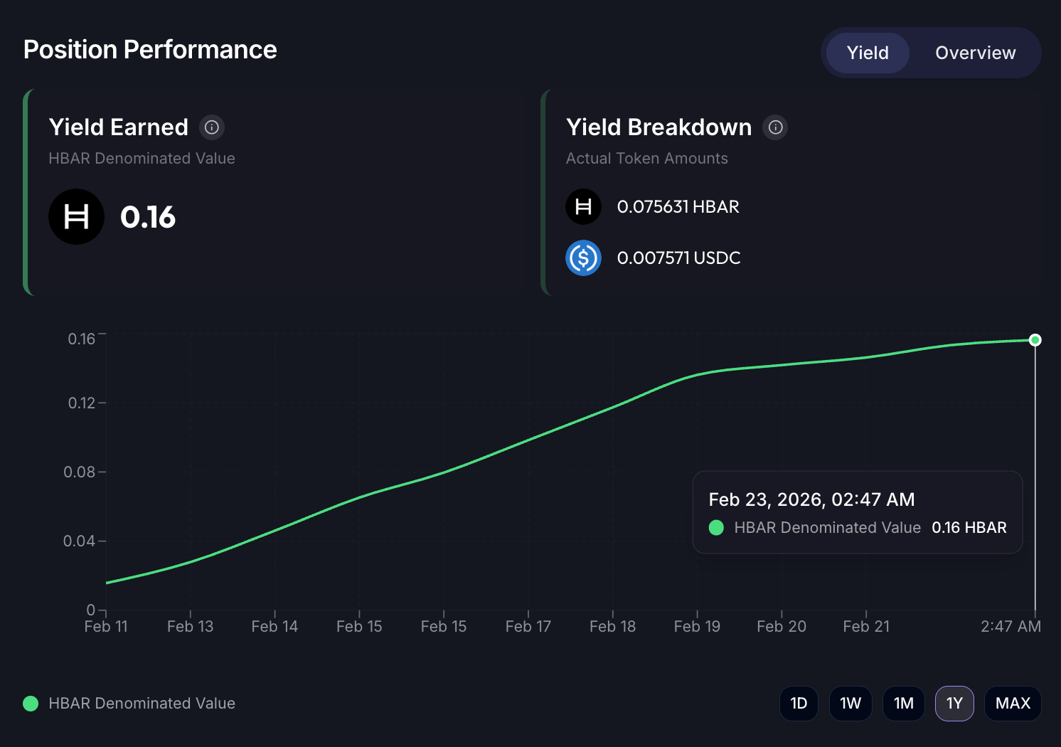 - "Earnings" is now "Yield Earned": The left box no longer displays a list of unrounded, hyper-specific decimal token amounts. It now shows a clean, single consolidated value denominated in the primary asset (in this case, HBAR).