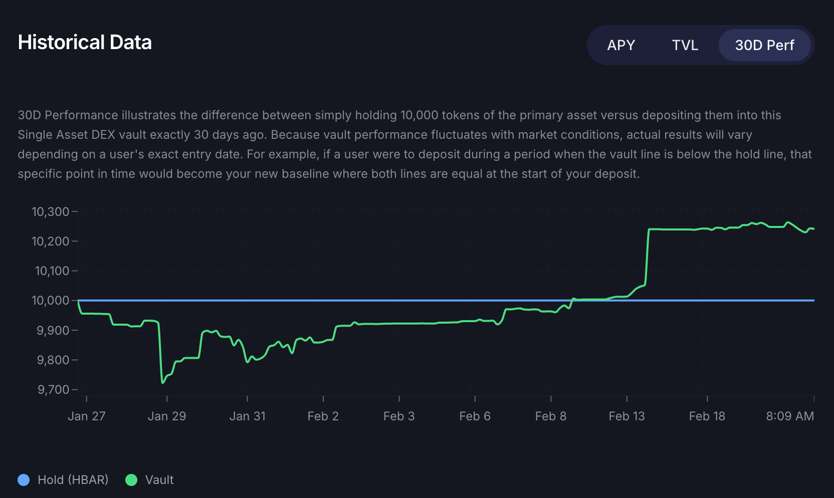 - How to read it: The 30D Performance chart illustrates the difference between holding 10,000 tokens of the primary asset versus depositing them into this vault exactly 30 days ago.