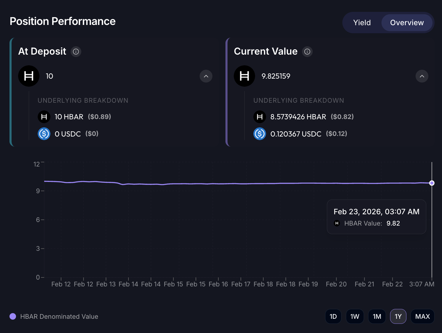 - Simplified Tooltips: Consistent with the other charts, the hover tooltip has been heavily minimized. It previously displayed a bulky list containing the total USD position value alongside individual Primary and Paired token amounts and their respective USD values. It now simply displays the date, time, and the single HBAR Value.