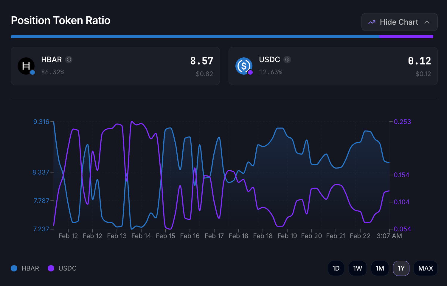 - Percentage Breakdowns Added: The individual asset boxes for Primary and Paired assets now explicitly state the exact percentage weight of each token in the position (e.g., 86.32% for HBAR and 12.63% for USDC in the example below). The previous iteration only displayed the raw token amount and the USD value.