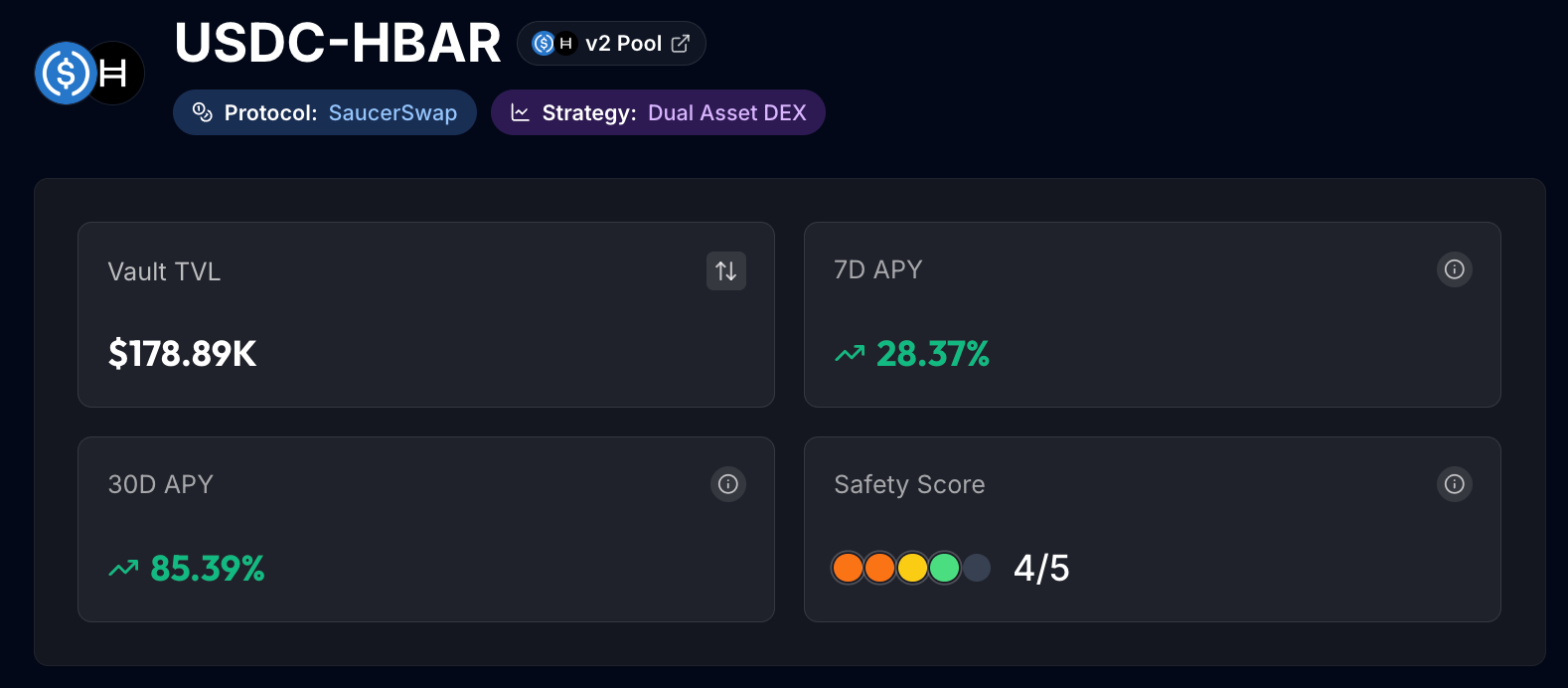 Upon beta availability, the APY information for Dual Asset DEX vaults displayed on both the individual vault pages and the main vaults page was based on the estimated APR (converted to an APY) of the underlying SaucerSwap v2 concentrated liquidity pool.