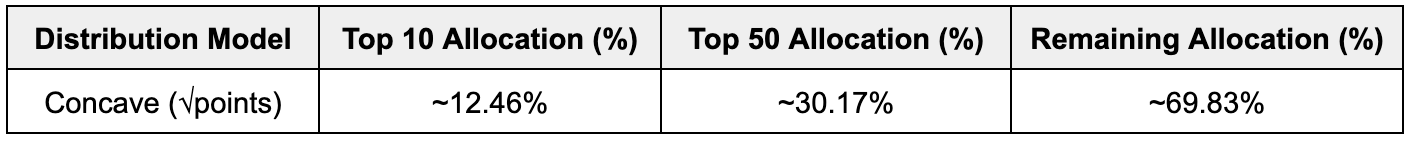 What was ultimately chosen chose a concave approach (using the square root of points). This method rewards higher contributions while applying diminishing returns. In thorough analysis of actual Season 2 points data, using a 8-million token pool, the concave model distributes rewards roughly as follows: