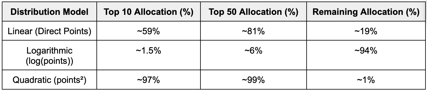 Conversely, a quadratic model (using points²) would have almost entirely favored the highest contributors, while a logarithmic model flattened differences so much that even top performers receive almost negligible rewards.
